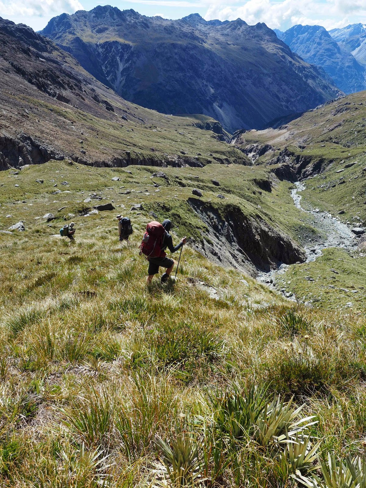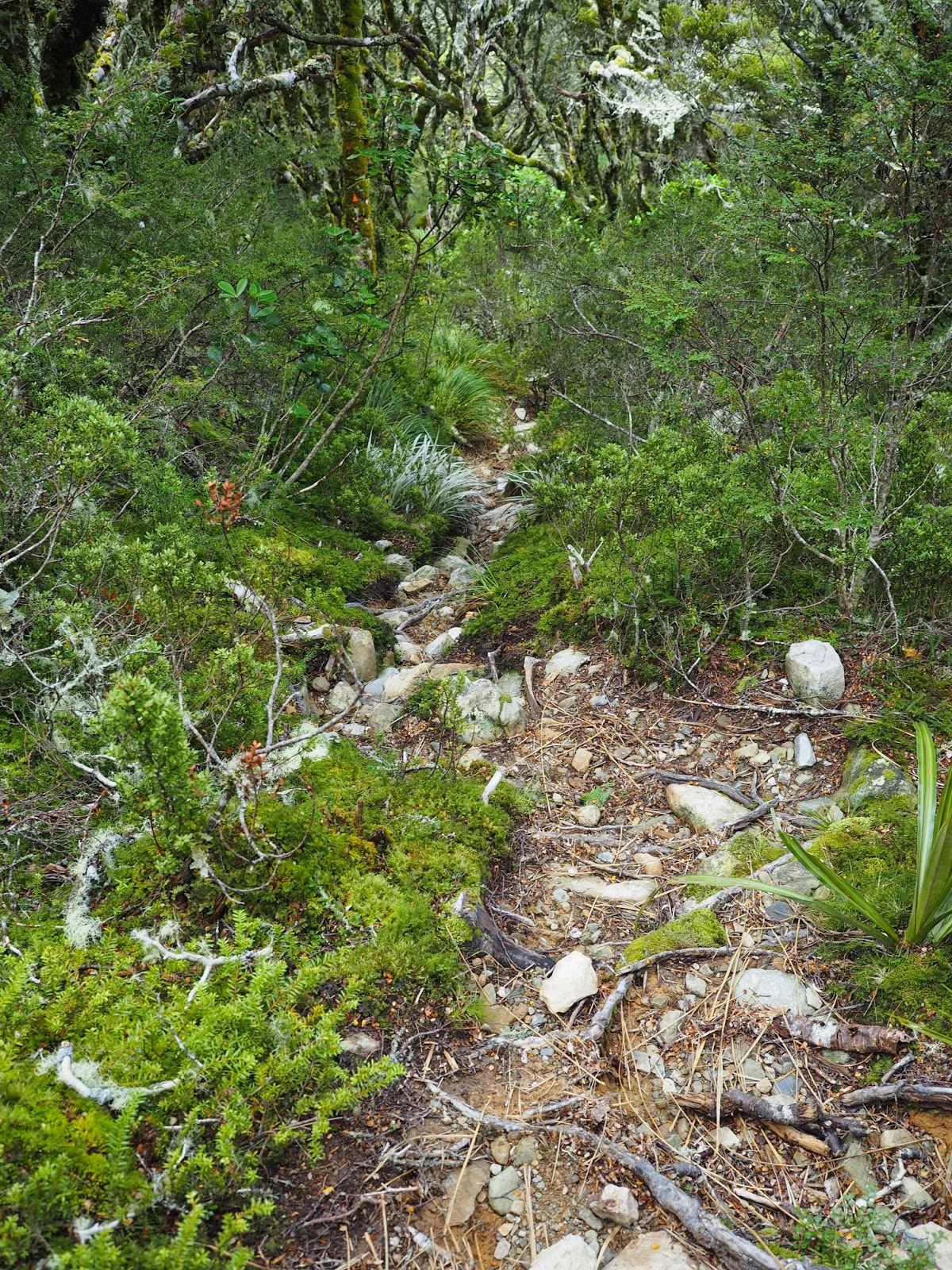 A relatively easy walk until we reach the clearing where the Beans Burn meets the Dart River. The rain gets heavier (but not enough to stop us crossing the Burn). With a dicky ankle slowing me down Ian insists on a “load redistribution” before we start the hard slog along the trappers trail beside the Dart.